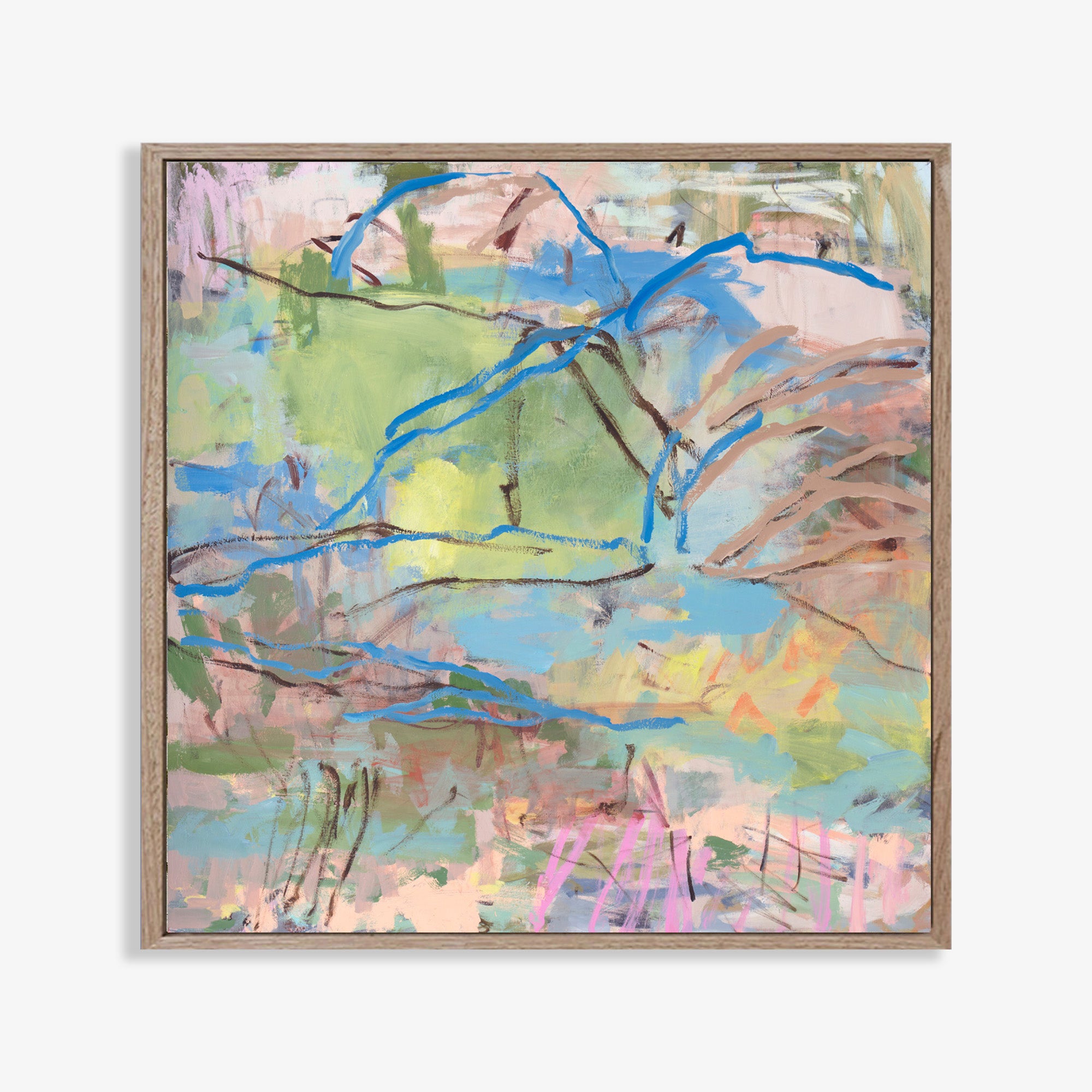 The painting hovers between land and feeling — not a literal place, but a remembered one. The ridgeline becomes a point of stillness, a moment of pause where the eye rests before moving again. Gestural and luminous, the work invites quiet immersion, allowing colour, rhythm, and intuition to guide the experience.