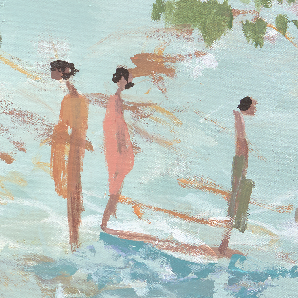 In Kin, the figures drift, gather, and rest within this liquid landscape, creating a visual language of connection that feels at once intimate and universal. The works invite the viewer to pause and consider the currents that bind us—how we are shaped by those we love, and how, in turn, we become part of the tide that shapes them.